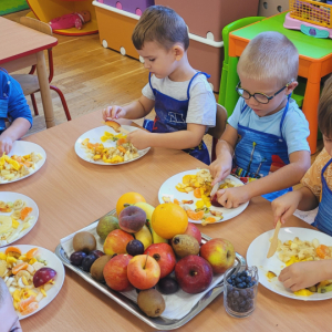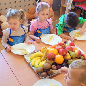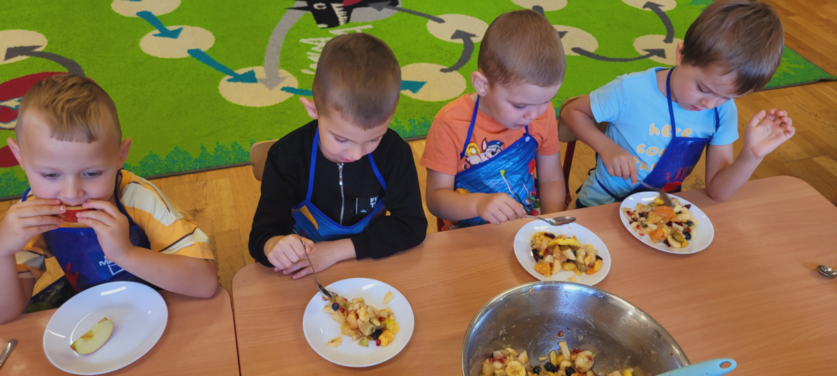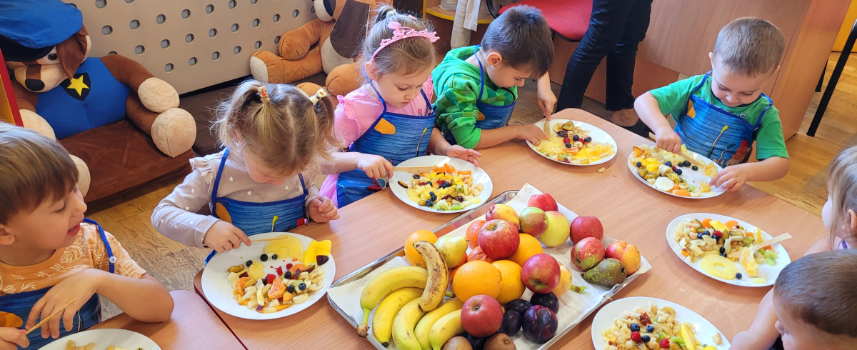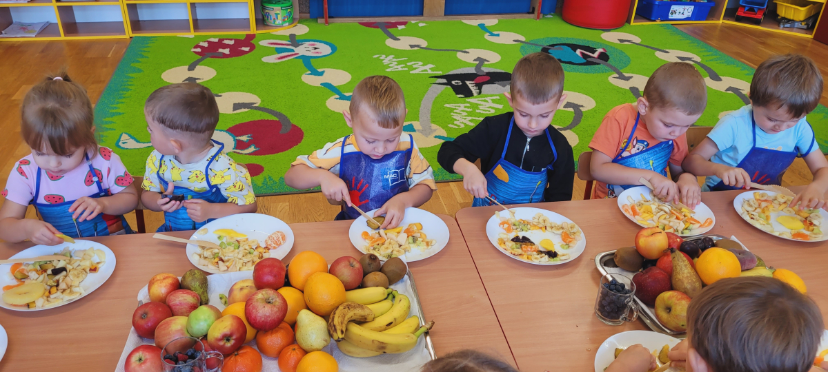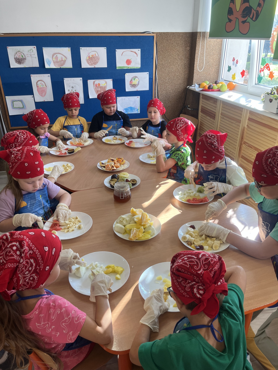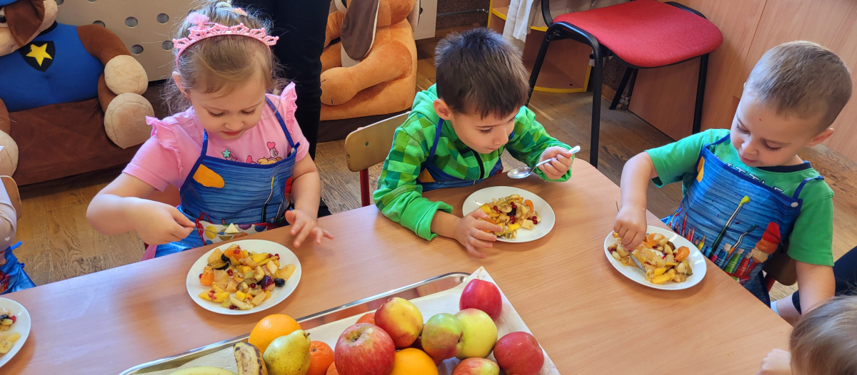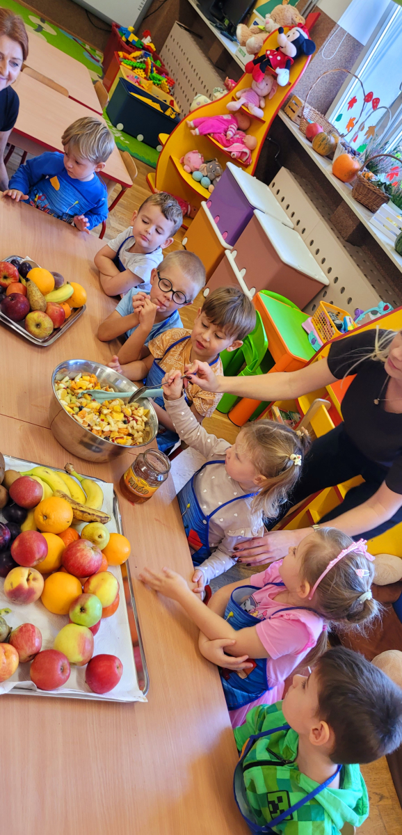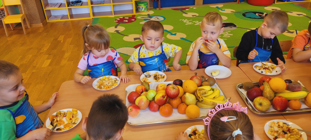 W tym tygodniu przedszkolaki odkrywały różne smaki! Poznawały owoce i warzywa, dowiedziały się, dlaczego są one tak ważne dla naszego zdrowia, a także miały okazję spróbować ich na różne sposoby. Najwięcej radości sprawiło wspólne przygotowanie pysznej sałatki owocowej pełnej kolorów i witamin!